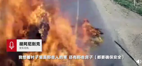 “我想着一定要确保村子的安全,不能引燃村里的草和房子,我就继续开了1公里左右,把车开到了村外。”胡阿尼别克表示,当时为了群众的安全,他只想把货车开到村外去。